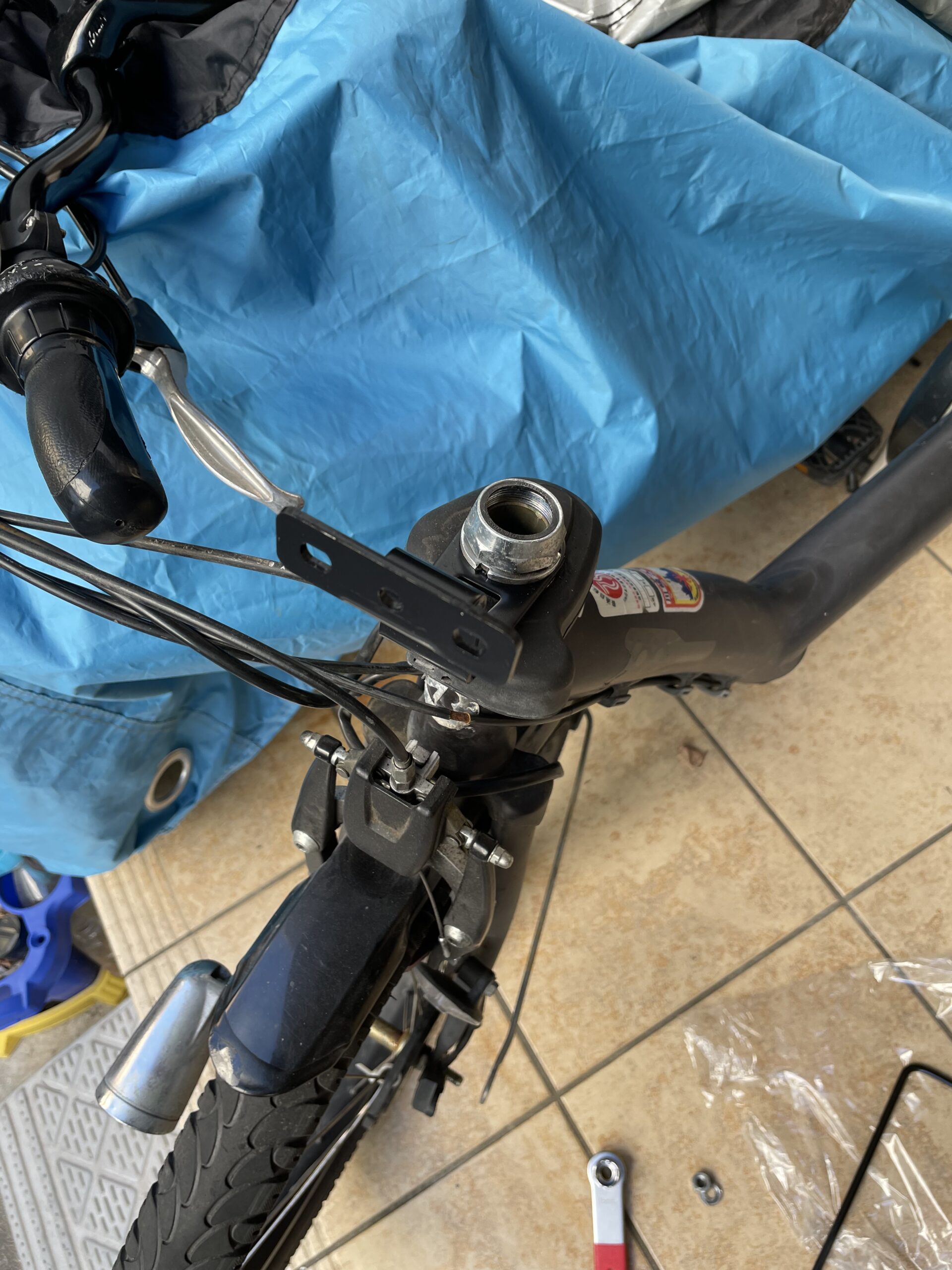 次にヘッド(ステムを取り付ける穴の周りの名称)のボルトを一旦外して、前かごのステーを取り付けます。ステーを取り付けたらボルトを元に戻します。