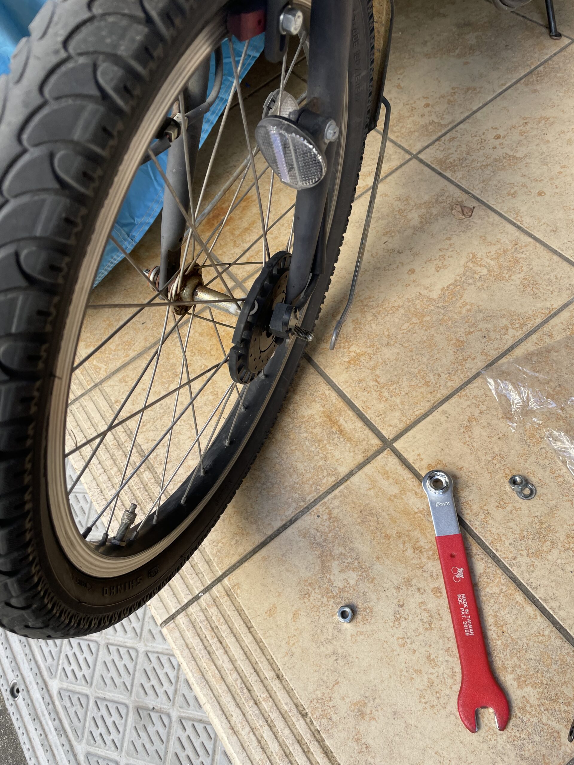 次に前輪を固定しているボルトを外し、バスケットステーを取り付けます。取り付けたらボルトは元通りに締めます。