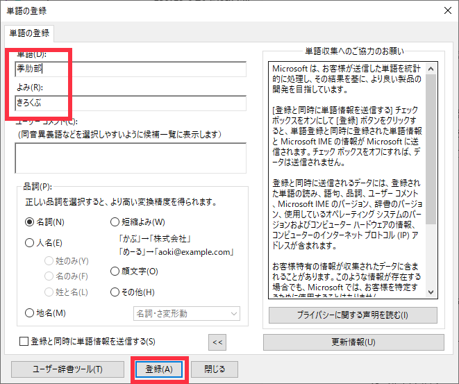 3. 単語を登録(例:季肋部)